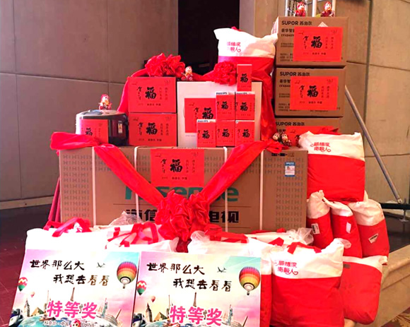 “科奈尔”总部为感谢员工一年来的努力拼搏,特在本次晚宴设置了抽奖环节,设有“世界那么大 我想去看看”海外旅游双份、Iphone 6手机一部、海信55英寸彩电2台、2016福运来大红包、科沃斯全自动扫地机器人3台、飞利浦剃须刀、苏泊尔电饭煲、松下无绳电熨斗等共百多份奖品,让所有科奈尔人每年都深深的感受到“科奈尔”对员工浓浓的爱。